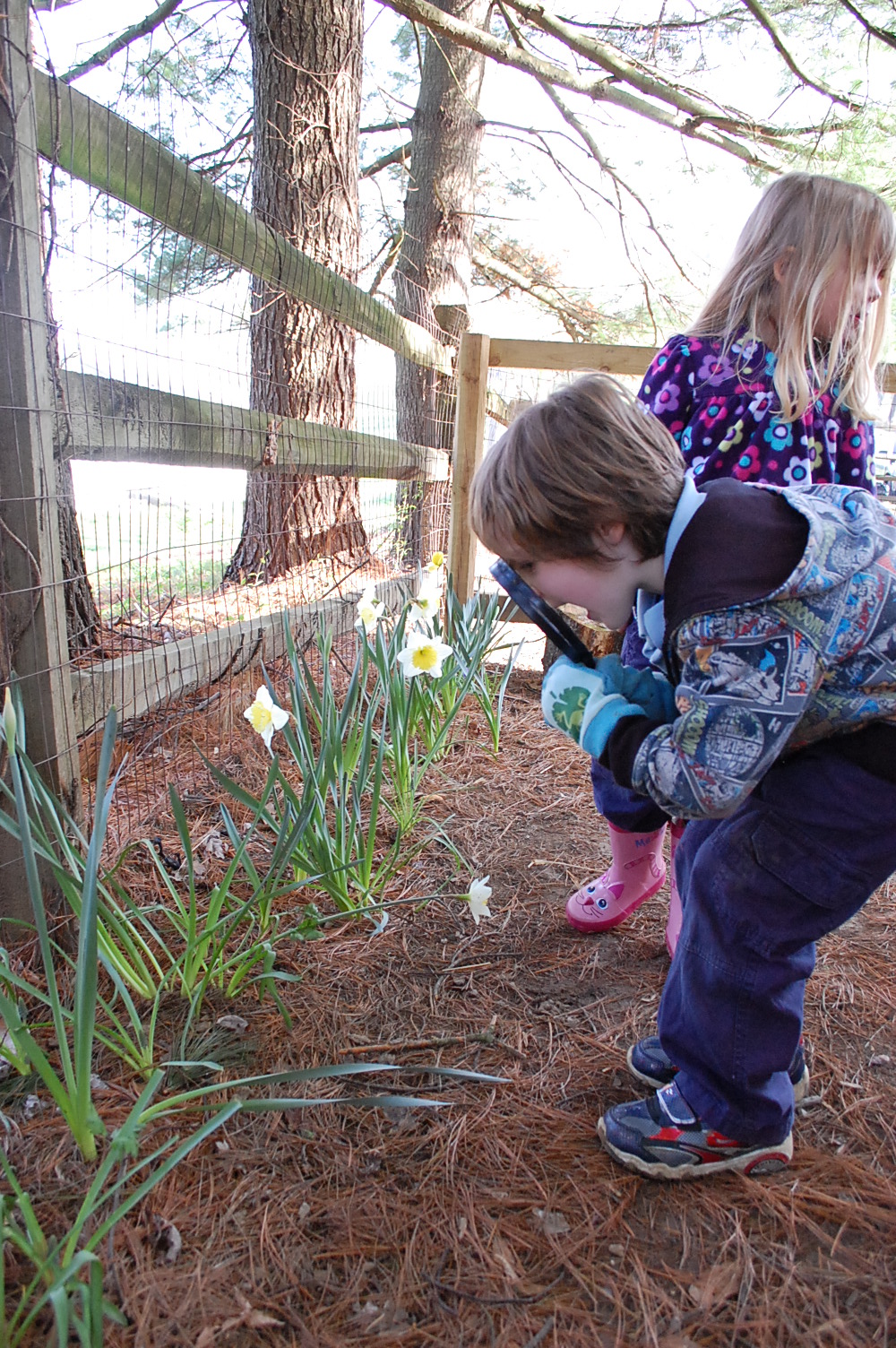 Last week was absolutely wonderful. Ms. Melodie's class walked outside one morning to discover their fall-planted blubs were in bloom. They had a great time looking at them up close with a magnifying glass. They also made some delicious coconut milk rice one day. Even the children who claimed not to like rice devoured it! Both classes have been decorating their trees for spring with little tissue paper flowers and the school is looking very lively.